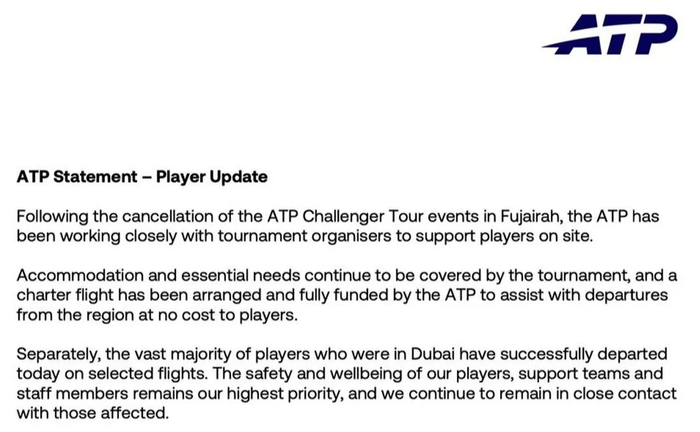 ATP声明全文ATP随后发布正式声明,强调将继续全力保障球员及工作人员的安全:“富查伊拉挑战赛取消后,ATP与赛事组织者保持紧密协作,为现场球员提供支持。赛事方继续提供住宿及基本生活保障,ATP安排并全额资助包机,帮助球员免费撤离该地区。同时,目前身处迪拜的绝大多数球员已于当日顺利搭乘指定航班离开。球员、支持团队及工作人员的安全与福祉始终是我们的首要任务,我们将持续与受影响人员保持密切联系。”